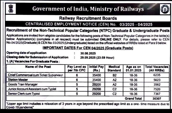 The Railway Recruitment Board (RRB) has announced the notification to fill up the 30307 Chief Commercial Ticket Supervisor, Station Master, Goods Train Manager, Junior Account Assistant and Typist, Senior Clerk and Typist Posts. Eligible applicants can use this opportunity to apply for these posts before the application deadline. Candidates who have completed Any Degree may apply for the RRB Recruitment 2025. The interested applicants can apply in online mode. Details provided include the education details, Age criteria, Selection procedure, Processing fee, salary, and Application process for these posts before the deadline. The application dates have already begun.