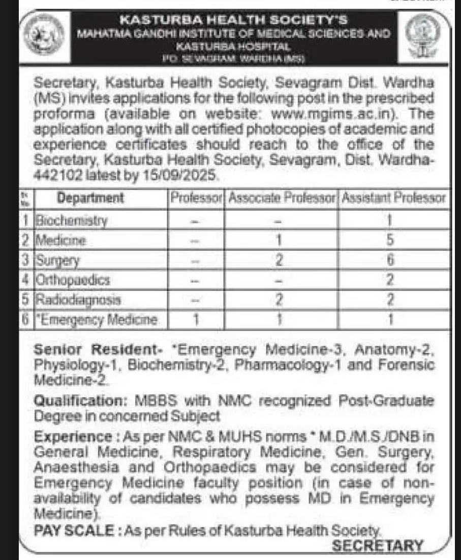 The Mahatma Gandhi Institute of Medical Sciences (MGIMS) has announced the notification to fill the vacancies of 35 Professor, Associate Professor, Assistant Professor, and Senior Resident Jobs. Eligible applicants can use this opportunity to apply for these posts before the application deadline. Candidates who have completed their MBBS, DNB, and Post-graduation may apply for the MGIMS Recruitment 2025. The interested applicants can apply in offline mode. Details provided include the education details, Age criteria, Selection procedure, Processing fee, salary, and Application process for these posts before the deadline. The application dates have already begun.