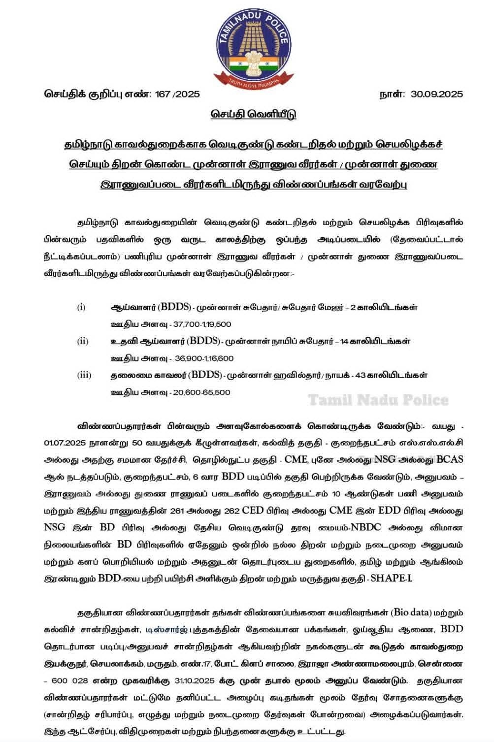The Tamil Nadu Uniformed Services Recruitment Board (TNUSRB) has announced the notification to fill the vacancies of 59 Inspector, Head Constable, and Assistant Inspector Jobs. Interested and eligibile candidates can use this opportunity to apply for these posts before the application deadline. Candidates who have completed their 10th pass may apply for the TNURSB Recruitment 2025. The interested applicants can apply in offline mode. Details provided include the education details, Age criteria, Selection procedure, Processing fee, salary, and Application process for these posts before the deadline. The application dates have already begun.