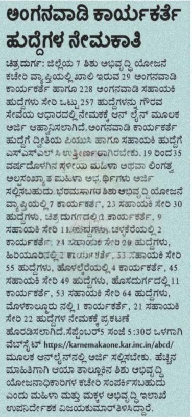 The Women and Child Development (WCD) Chitradurga has declared the latest job notification for 2025. To recruit candidates for 257 Anganwadi Worker and Helper Jobs. Those candidates who have qualified in the 10th Pass can grab this chance and apply for these posts. Information includes the Age criteria, Selection procedure, salary structure, education details, Processing fee, and Application process for the WCD Chitradurga Recruitment 2025. Desirable candidates can Submit application online through the website before the application deadline. For more details, visit the Official portal.